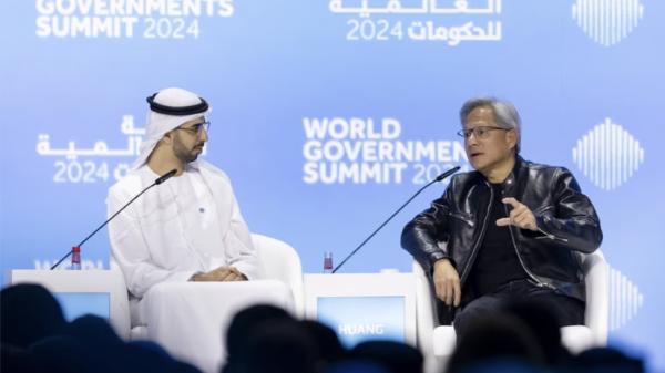 黄仁勋在2024 年2月12日“世界政府峰会”上与阿联酋国务大臣Omar Sultan AlOlama最新对谈里,确实提到了 AI 和算力所需能源巨大,但他的原话如下: