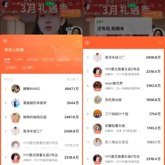 在视频号带货小时榜中,中老年女装品牌汇聚一堂,各显神通,壹娱观察随机记录两个时间点,就能发现中老年女装赛道的竞争激烈。2月29日中午12点,壹娱观察(ID:yiyuguancha)发现,在总榜前十名的上一赛段带货直播间中,服饰类直播间占据过半,分别是“西子小老板娘”、“深圳国风香云纱3店”、“YIYI意式高奢女装2号店”等,其中榜一和榜二的热力值都超过3000万;而到了3月11日下午3点左右,再度查看小时榜的时候,原创以新中式为卖点的高级女装博主婵婵WANG拔得头筹,而前十名的位置里,除了“mom看世界”之外,几乎都是涉及到女装品牌的博主,有从形体、瑜伽切入,也有从羊绒、中式、真丝等质地样款接入。