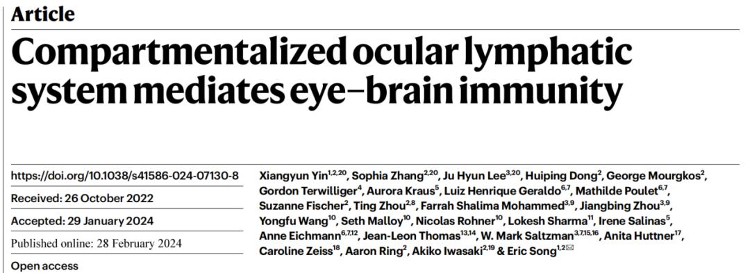 Yin X, Zhang S, Lee J H, et al. Compartmentalized ocular lymphatic system mediates eye–brain immunity[J]. Nature, 2024: 1-8.