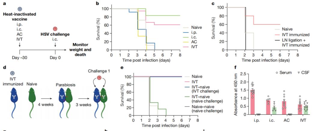 不仅如此,研究人员发现,IVT还可以对除HSV-2之外的多种病原体产生眼脑免疫反应,比如HSV-1和肺炎链球菌,后者是细菌性脑膜炎的主要病原体;即使颅内存在肿瘤的情况下,通过IVT或颅内途径进行的免疫也可以提供相应保护。当然,免疫途径及其保护作用与感染或肿瘤的类型有关,比如在皮肤黑色素瘤模型中,皮下免疫的效果就优于颅内或IVT免疫。