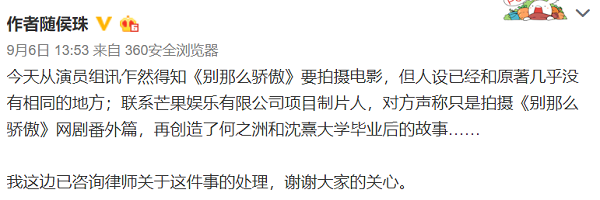 但烦恼也随之而来。2016年,随侯珠第一部被翻拍的作品《别那么骄傲》以网剧的形式播出,这部剧从选角到改编都可谓受到原著党的一致否定,随侯珠也对此不置可否。令她愤怒的是在网剧播出2年后,今年9月她骤然得知《别那么骄傲》要拍衍生电影,人设已经和原著几乎没有相同之处。