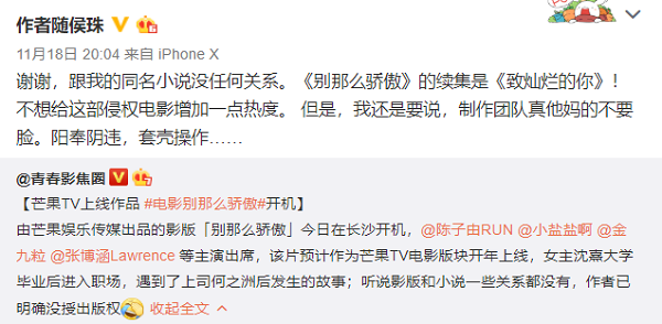 其实拍摄一部网络大电影也是非常不容易的事,我也希望任何努力都可以获得尊重和认可,但如果他们是想借着《别那么骄傲》的IP最后蹭点热度,我希望这样一个错误的行为能及时终止,我也有找律师进一步咨询。