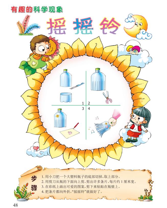 原理“摇摇铃”做好了,摇动它,就会发出美妙的声音。这是因为许多塑料条片相互碰撞摩擦,就会产生声音。
