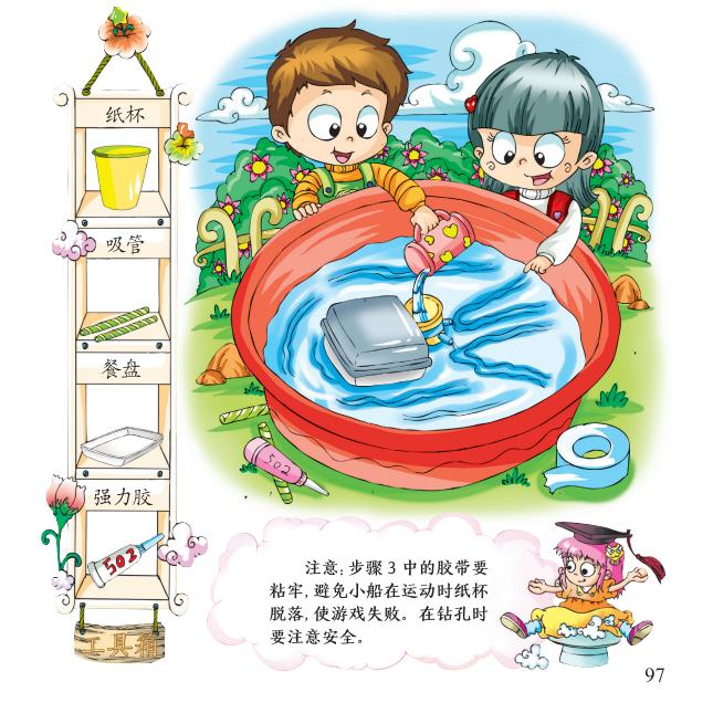 原理水倒入纸杯的时候,会从吸管里流出,对盆中的水形成一股向后的推动力,而盆里的水对船的反作用力将纸杯船向前推进。