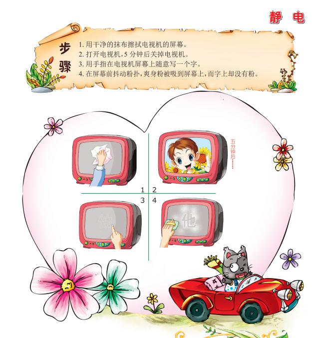 原理刚刚关闭的电视机,屏幕上会存留有静电,在屏幕上写字时,手指触碰的地方电荷会被消除,也就不能吸附爽身粉了。