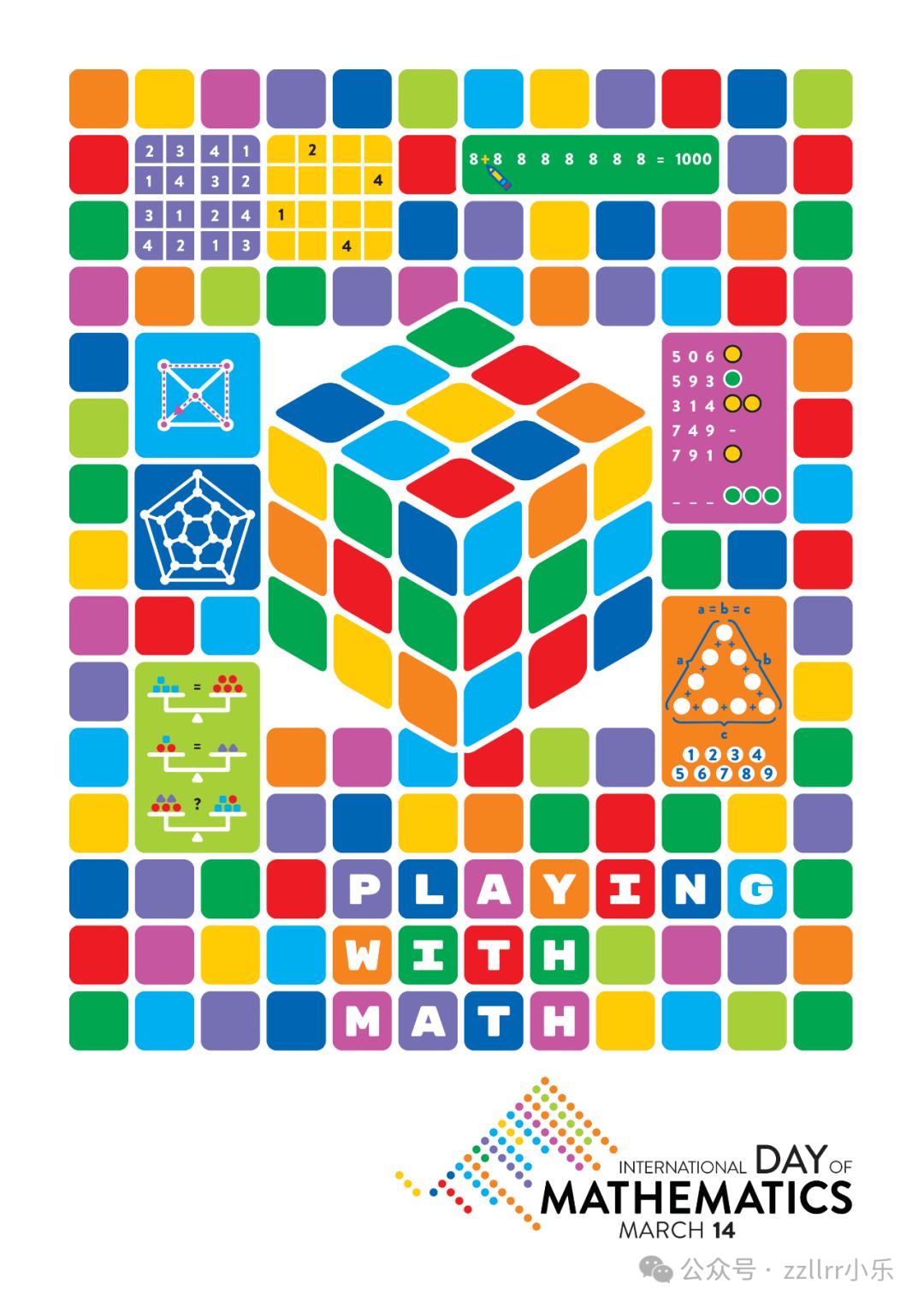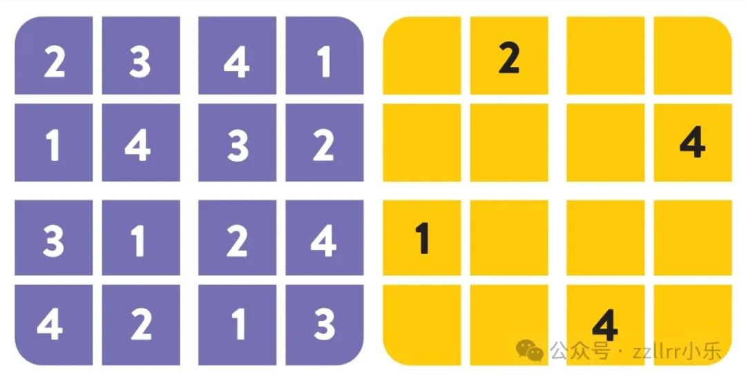 总的来说,今年国际数学日的主题是Playing with Math(玩数学,玩转数学——官方的文言译法是游于数,也很优雅的感觉),鼓励男女老少所有人参与,不仅题目无文字(打破国界语言限制),而且有巧妙设计的示例引导,多琢磨琢磨,放松心态,不要想得那么复杂,还是容易猜出问题的意思的(尽管求解未必都很容易,进一步钻研下去话可深可浅)。第1题,是数独(Sudoku),4宫格(4×4的格子),左侧紫色部分是示例,右侧是题目,要求数字1~4,在每一行、每一列、每一宫(即4个被粗线条分隔的2×2的田字格)都只出现1次。