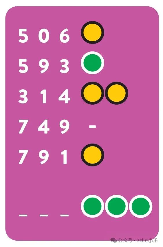 第4题,是猜数字游戏(类似于字符版游戏:Wordle)。结合各行左侧的数字和右侧的提示,得出最终的3位数答案。其中每一行根据左侧数字与最终答案数字进行比较的不同情况,分别给出黄灯——有数字相符但数字所处位置不符、绿灯——有数字和对应位置都相符、-中划线——没有数字相符。灯的个数,就表示有几个数字符合对应的情况。