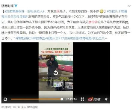 零下10度的户外,冷风习习,一位父亲白天刚刚结束送外卖的工作,晚上还要在街头卖唱。