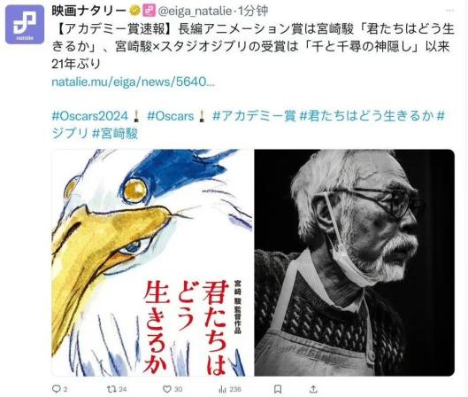 2024年3月10日,第96届奥斯卡最佳动画长片奖颁给了宫崎骏的新片《你想活出怎样的人生》。