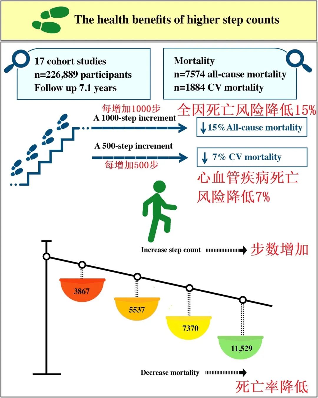 不必怕走少了,只要走起来就有益,一项研究发现[图1],每日大约走3867步,就能降低全因死亡风险,走的更多,益处加大;即使只走约2337步,也能降低心血管疾病死亡风险。