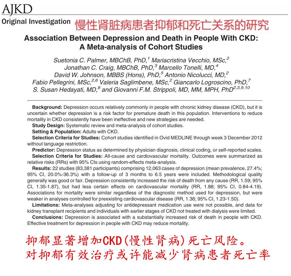2.Palmer SC, Vecchio M, Craig JC, et al. Association between depression and death in people with CKD: a meta-analysis of cohort studies. Am J Kidney Dis. 2013;62(3):493-505.