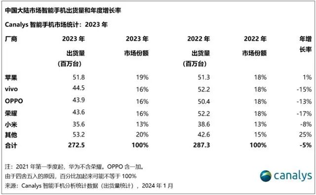 2023年全年,根据Canalys数据显示,苹果首次夺得中国大陆市场全年出货第一位置,同比出货微增1%,全年市场份额进一步提升至19%。vivo,OPPO和荣耀势均力敌,企稳在16%的市场份额,全年分别出货4450万台、4390万台、4360万台。小米以13%维持在全年市场第五。