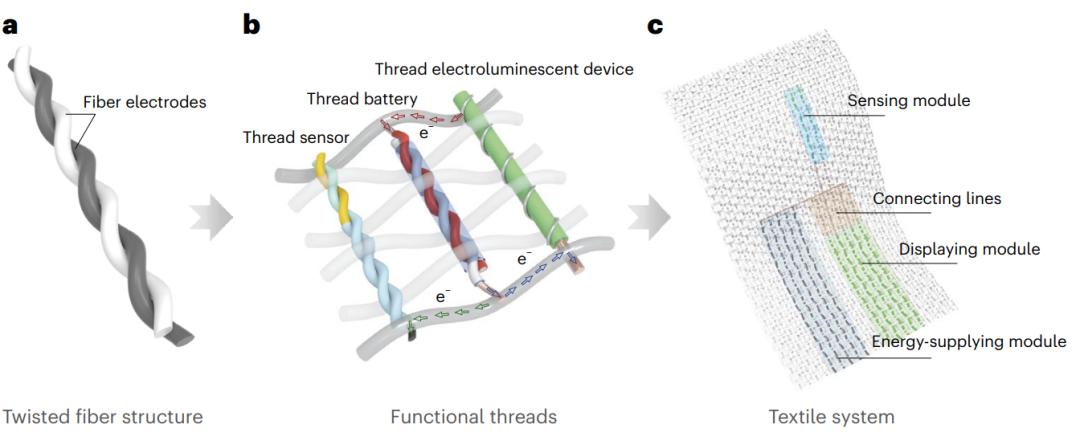 / 将储能、传感和显示集成到一件衣服上 /在电子线程的设计和制备方面,该工艺利用扭曲结构构建了一系列稳定的纤维电极,并基于此制备了三种不同功能的纤维设备。首先,在电导纤维基底上涂覆或电镀活性材料以制备纤维电极,然后将纤维阳极和阴极扭曲成线状设备。扭曲结构提供了适量的内部应力,确保了纤维设备的稳定性,并使其非常适合日常穿戴纺织品。通过调整扭曲的方式,作者制备线电池、线电化学传感器和线电致发光器件等代表性纤维设备——通过精细调节制备参数,实现了高性能的纤维锂离子电池(TLIBs)、微型传感器系统(MSTs)、纤维发光电极器件(TELDs)以及集成纺织系统。