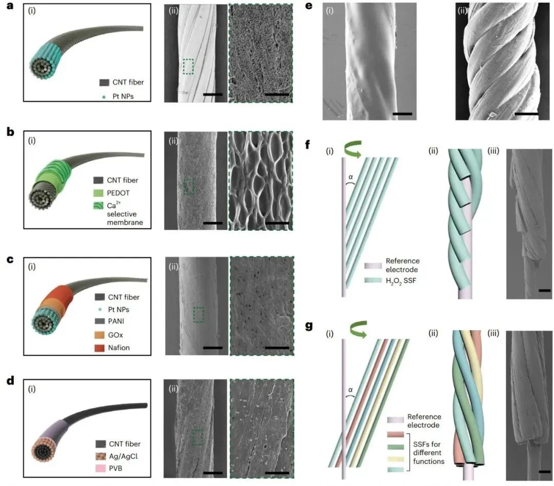 接着文章描述了制备MSTs的步骤以及对其结构特性和感测性能的表征。其中包括了制备碳纳米管(CNT)纤维、离子传感器纤维、过氧化氢传感器纤维、葡萄糖传感器纤维和参考电极的步骤。制备过程中涉及到各种化学溶液的配制、涂覆、干燥、存储等步骤,以及使用化学气相沉积和电化学方法。最后,对MSTs的结构和感测性能进行了表征,包括扫描电子显微镜观察、电化学测试和柔性电子测试等。