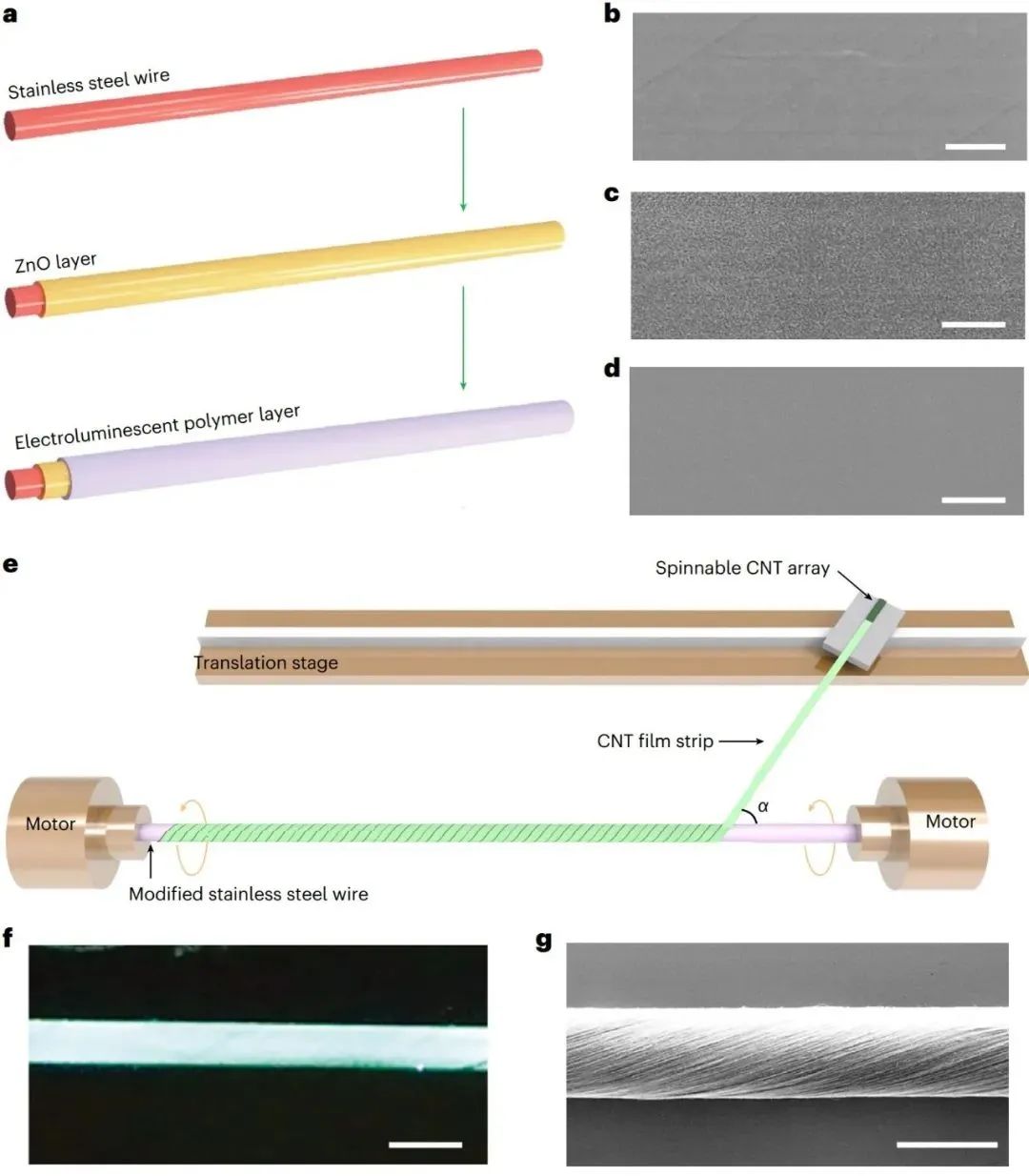 TELDs由光纤发光电极和碳纳米管(CNT)带组成。制备光纤发光电极包括对不锈钢丝进行清洁、涂覆氧化锌(ZnO)前驱体溶液和活性发光混合浆料,然后对其进行真空干燥和存储。CNT带的制备包括通过电子束蒸发法在硅片上沉积铝氧化物和铁薄膜,然后将其放入管式炉中进行化学气相沉积以生长碳纳米管,最后切割并固定CNT带。TELDs的组装涉及将CNT带缠绕在光纤发光电极上,同时设置旋转和平移运动来实现均匀缠绕。最后,对TELDs的结构和发光性能进行了表征,包括形貌分析和发光强度测量,以及在经历弯曲后的发光性能测试。