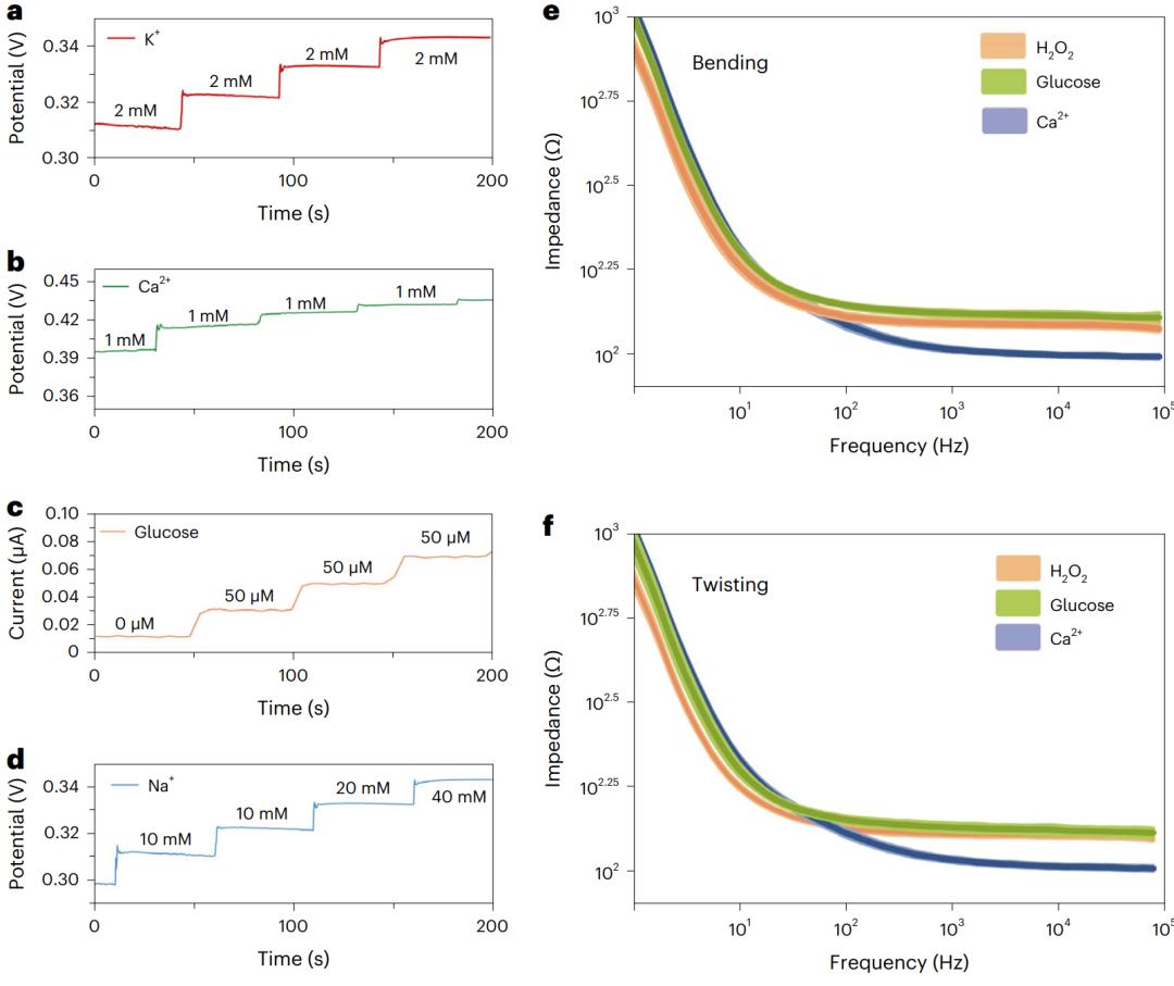图6 | 纤维锂离子电池(TLIBs)的电化学性能和稳定性。对于微型传感器系统(MSTs),利用CNT纤维的高比表面积和电导率,形成了均匀的表面层,确保了传感器的有效性能(图7a–d)。MSTs的稳定的扭曲结构和内在的柔性使得每个传感器的性能不受干扰(图7e,f)。