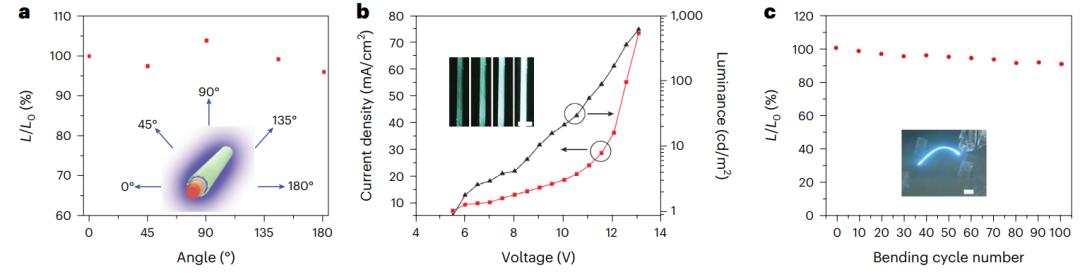 图7 | MST的多模感应性能和稳定性。对于纤维发光电极器件(TELDs),通过调节涂层工艺构建了连续均匀的ZnO层,使得TLIBs表现出一致的亮度,且在变形时仍保持稳定。