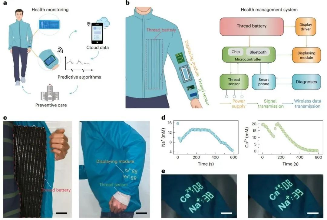 在电路设计和将电子线程集成到纺织系统中的过程中,作者设计了有组织的纤维设备排列和互连电路,组装成供能、传感和显示模块。还开发了逻辑电路来连接不同的功能模块,并利用导电纤维。能源供应和传感模块分别连接到微控制器,用于能量分配的控制和传感信号的实时采集。最后,作为一个原型,作者成功地将该系统缝制在一件夹克上,并能够实时显示志愿者的汗液离子水平。