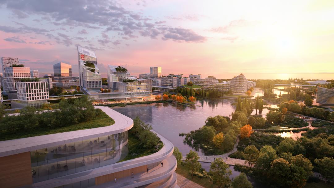 比如,北京未来科学城内建设了面积3.14平方公里的滨水公园;深圳光明科学城总体空间布局强调塑造舒展起伏、疏密有度的城市空间形态,形成“湖光山色入城,蓝绿活力交织”的田园都市。