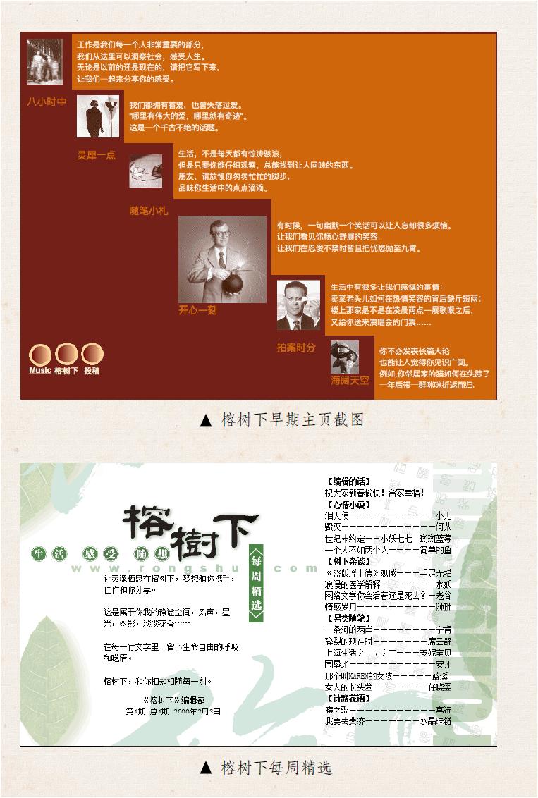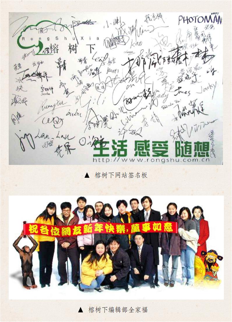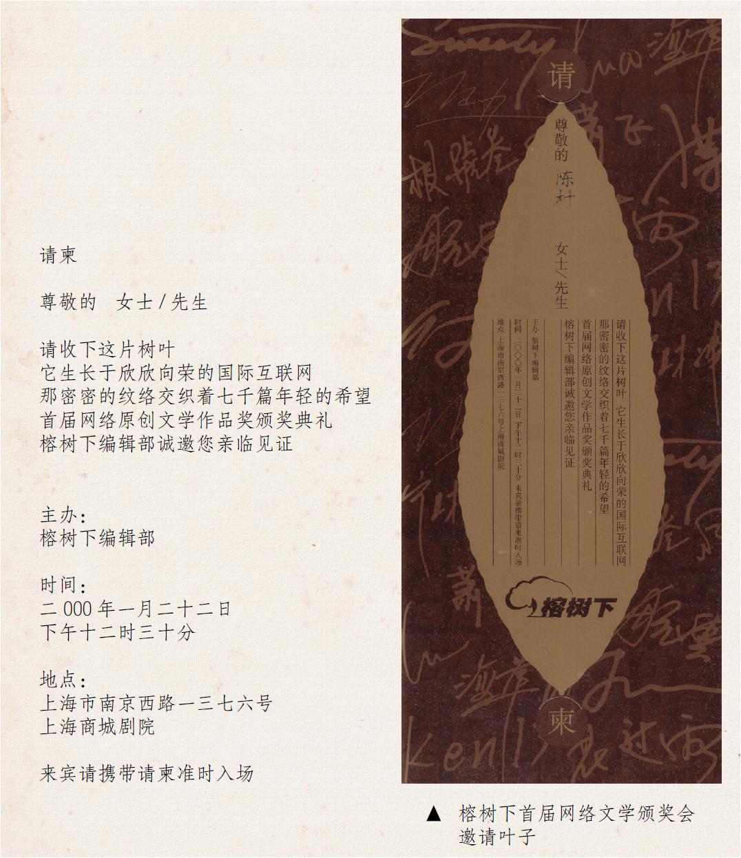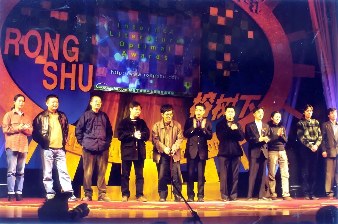 榕树颁奖 首届榕树下大赛颁奖大会。王安忆,王朔,阿城,余华,陈村,宁财神,邢育森,李寻欢,安妮宝贝,Sieg。2000,上海榕树下网站的全称是榕树下计算机有限公司(域名:http://www.rongshu.com),冠以“全球中文原创作品网站”的帽子。“生活·感受·随想”是公司理念。公司地址在上海北京西路一三九九号的建京大厦十二楼。老板是美籍华人朱威廉,不到三十岁,我们叫他Will。这类公司人人都有个英文的网名,彼此直呼其名。将名字印到茶杯上的时候问我叫什么,我想起一个卫生用品的商标名,说,就叫toto吧。小写,免得跟名牌小便斗冲突。