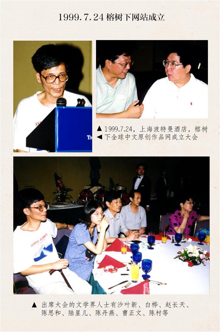 一九九九年夏天,我接到一个电话。打电话的姑娘叫何从,邀请我七月二十四日出席榕树下网站的开张典礼,在波特曼酒店。网络文学我听说过,也读过一点作品(后文再谈)。那天我是带着女儿去的。留下的照片上,有沙叶新和我在台上发言,陈思和与老沙聊天,有我跟女儿和沙叶新等一起吃饭。与会的作家还有白桦、赵长天、陆星儿、曹正文等。原本就是去看着玩玩,谁知会后被网站的创始人朱威廉先生邀请,期待我能参与网站的工作。谈了一下。正如上文提到的,我对电脑和网络非常有兴趣,对文学的未来有所猜测,深感好奇。就这样,我成了当年唯一一个以工作姿态介入网络文学网站运营的职业作家。