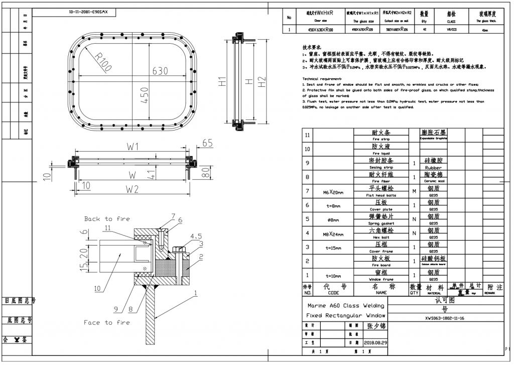 2、防火玻璃由两层钢化玻璃及夹在中间的防火胶构成,其中一层钢化玻璃要比另一层钢化玻璃厚。3、A-60防火窗需通过耐火试验,并取得船级社的船用产品证书。