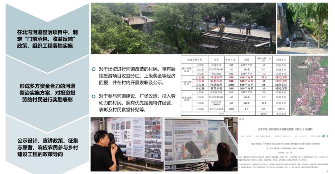 针对村庄人才服务,项目组建立乡村人才库并向村内企业进行推介,用经济回报和弹性岗位吸引年轻人回村;通过颁发第一书记、荣誉村民等称号实现外来投资人的身份认同;在河道整治项目中项目组提出“门前承包、收益反哺”机制,通过奖金补贴和表彰公示鼓励村民自发参村庄建设;并制定村-企-民共同参与的村庄建设路线总图,关注每个项目谁主导、谁投资、谁获益,引导政府资金精准投资、汇集各方力量进行补位。