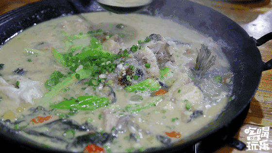 浓稠的鱼汤翻滚起奶白的汤汁,腾腾的冒着热气。一层金黄的薄油漂浮在鱼汤表面,青绿的切片苦瓜在锅中和鱼肉一起亨煮着。