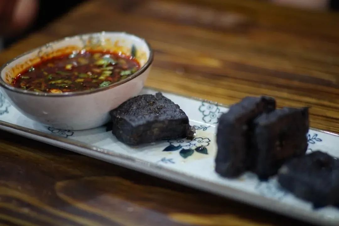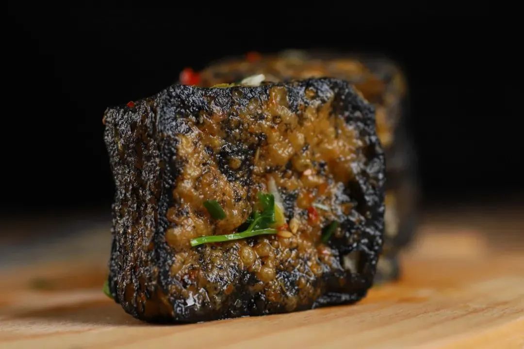 由冬菇、鲜冬笋、曲酒、浏阳豆豉特制成的活水发酵水,再浸入老嫩适中的豆腐,过上10天再取出,用小油锅慢火炸熟,再浇上一勺红油辣椒,咬上一口,汁水直飙,咸鲜味辣。