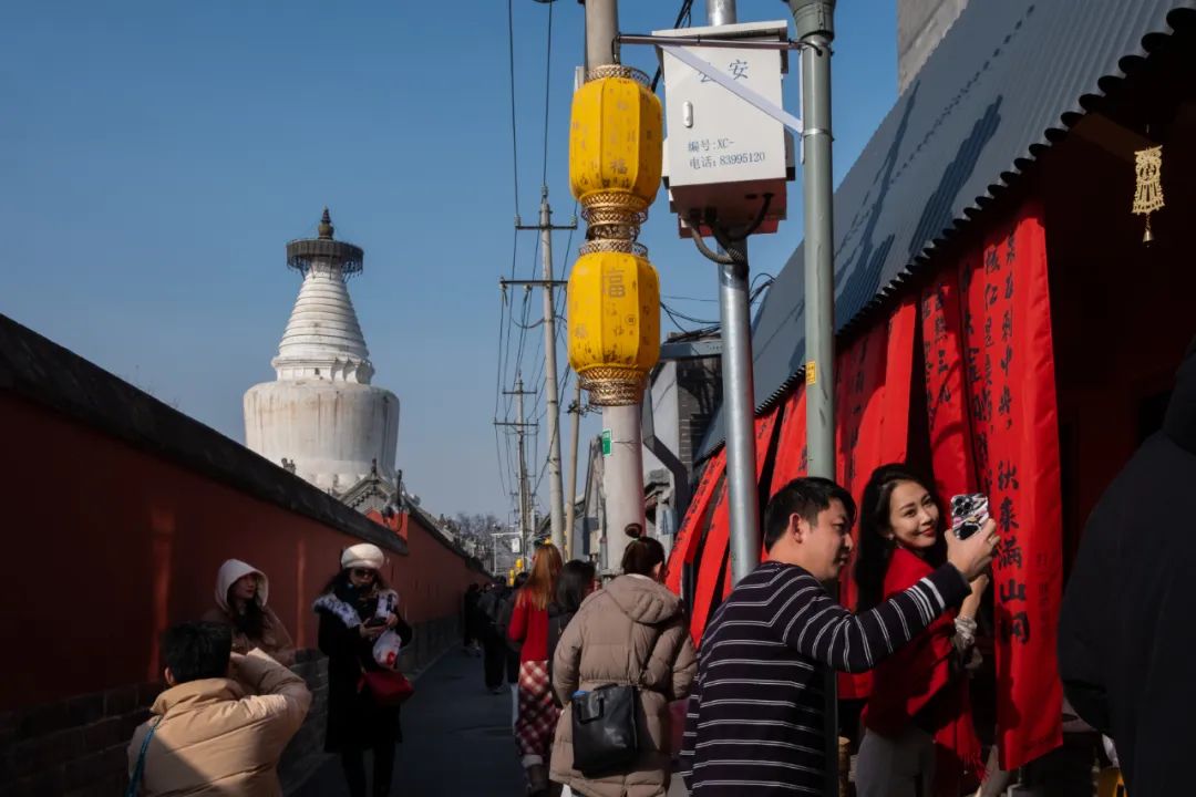北京白塔寺附近胡同,时尚的中草药灯谜吸引了不少年轻人拍照“打卡”。古老的白塔与胡同相得益彰,整饬一新的白塔寺附近街区已成为人们城市漫游的“打卡圣地”。有人说这一带“磁场强”,能很好地治愈精神内耗;也有人称这里有“北京最美胡同”。热门的“打卡”店中就有百年老字号药店——白塔寺药店。