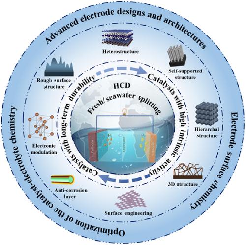 图5. 优化电催化剂和电解质相互作用提高性能的策略基于以上策略,本文深入讨论了HCD淡水/海水电解中HER、OER和全解水反应的多相催化剂的研究进展,并从催化剂设计的角度讨论了HCD对电催化剂的影响(图6)。