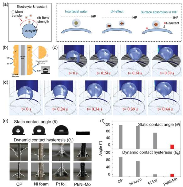 图4. 应变工程策略调节催化剂材料表面化学通过改变反应中间体和活性位点之间的键强度、调控传质效率,以及维持适当的pH值等方法可以优化催化剂和电解液之间的化学作用,从而改变催化剂的反应机理和活性。此外,提高催化剂的润湿性可以提高HCD性能(图5)。
