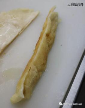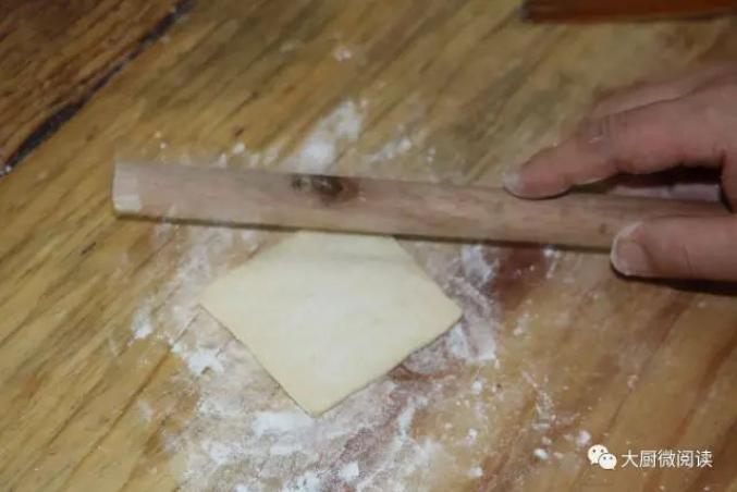 1.取出提前开好的酥皮,捶打摁压变成薄片。