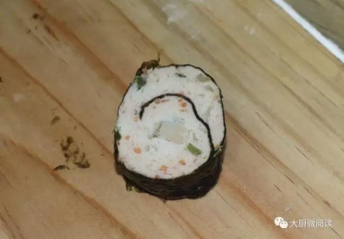 在紫菜里面包入西芹墨鱼胶,蒸熟后油炸至紫菜酥脆,裱上少许沙拉酱,外形似寿司,但口味截然不同。制作流程: