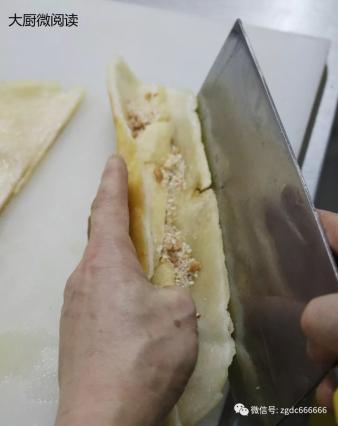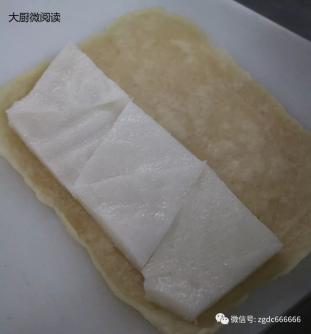5.加入边角料,将两边糯米片沿刀痕折起。