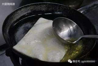 走菜流程:1.锅入色拉油350克烧至五成热,下“面泥”500克,用勺子背慢慢将其按成圆片,保持小火不停碾压至直径为25厘米,期间圆片表面膨胀,鼓起大泡,待其底面变成金黄色时,取出沥油,整个过程约需3分钟。