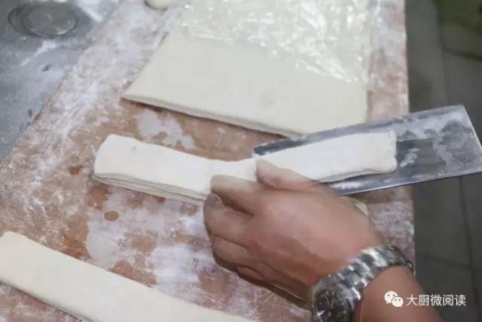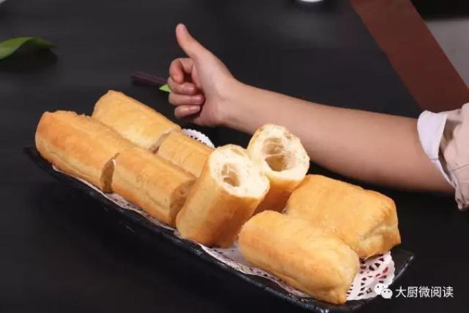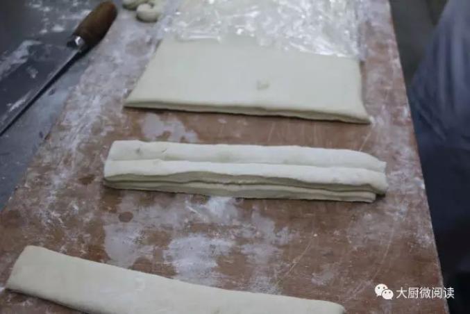 这只大油条成品长约32厘米,切开后内部中空,吃起来不似普通油条那般柔韧,而是酥香化渣,有一股饼干的口感,而且即便放置一小时,其质地仍然是脆的。在制作时,这款油条不加臭粉,以泡打粉、酵母、猪油起酥,配方更健康。和面:
