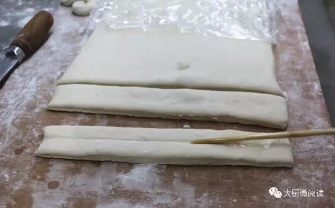 4.用刀背沿中线摁压结实,使之粘连变成一块油条生坯,总重量为200克。