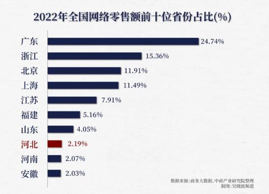 这基本也是电商行业的共识。与之佐证的是,2022年,河北网络零售额居全国第八、在北方省市中居第三。2022年前三季度网络零售额全国增速第一,高于全国整体增速16.5个百分点,这只寂寞的“大手”开始借助电商隐隐展示力量。