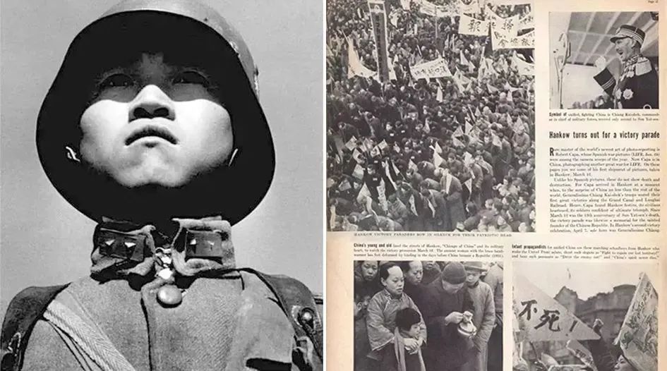 ▲1938年,罗伯特·卡帕镜头下的中国抗战。图源:网络在中国期间,卡帕拍摄了武汉空战、抗日救亡宣传、台儿庄战役的照片及战争苦难中的民众生活,并发表于《生活》周刊上。