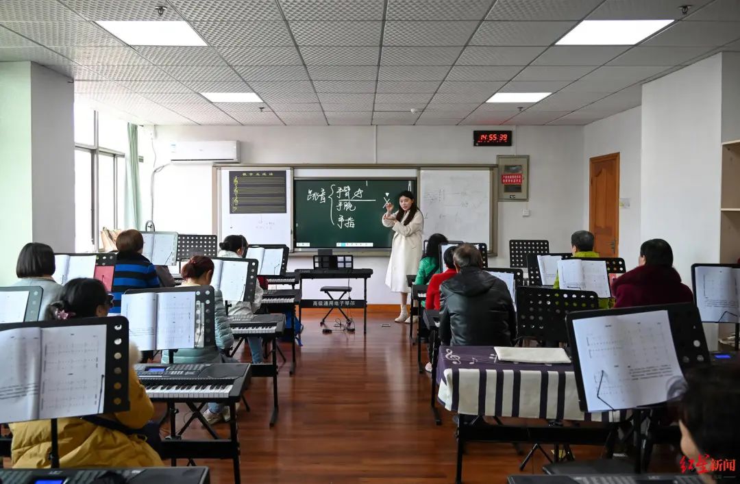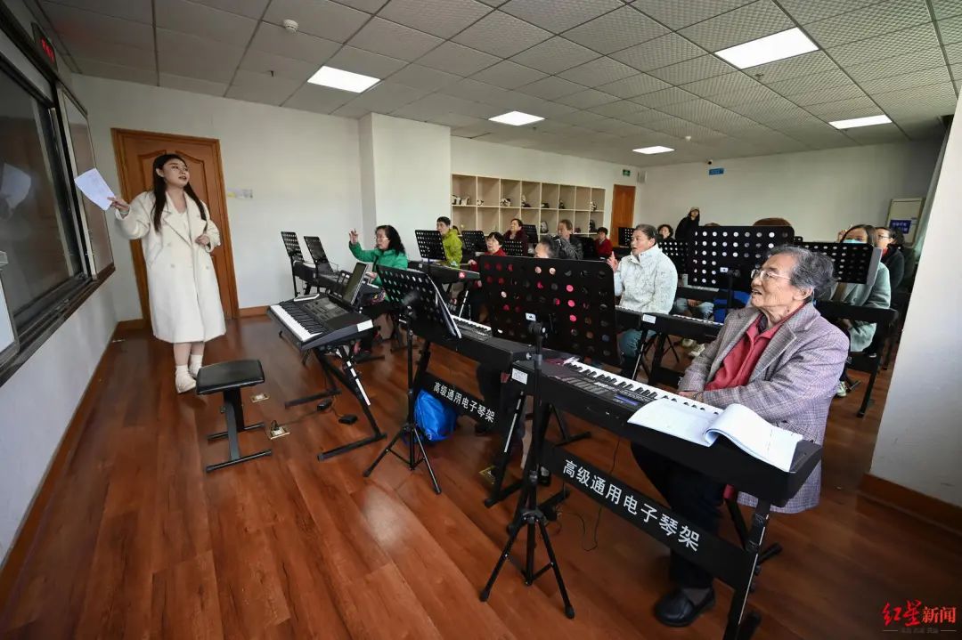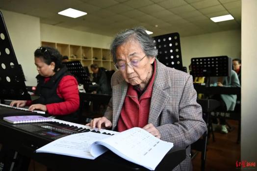 ▲成都市金牛区老年开放大学,93岁的骆婆婆在这里学习电子琴这不是她第一次上课。此前因为超龄,她被一些学校婉拒。去年,骆婆婆开始到成都市金牛区老年开放大学上课。声乐、英语、器乐都是学习课程。