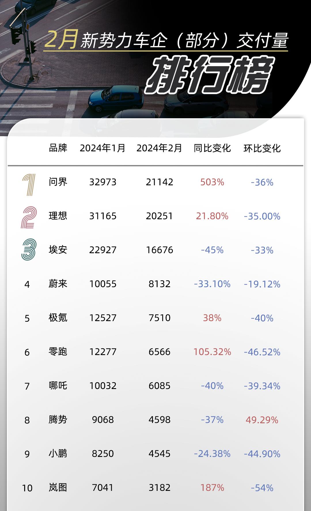 理想与问界激烈厮杀,其他新势力车企销量大幅下坡,多家 2 月交付量均未突破万台。零跑、腾势、岚图、小鹏环比销量近“腰斩”,蔚来环比下滑幅度最小 19%。