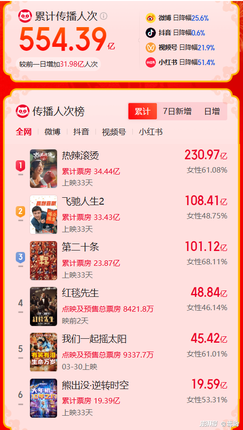 问题出在哪呢?传播度肯定是足够的,铺天盖地的热搜和舆论话题从未少过。根据猫眼专业版的统计,截至春节档结束,春节档电影的累计传播人次达到了554.39亿,光是《热辣滚烫》就达到了230.97亿。