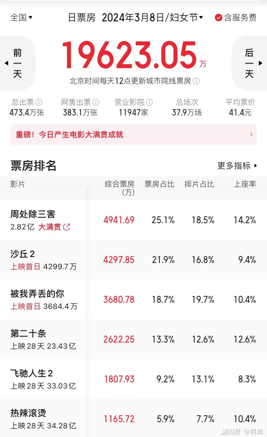 直到今年,随着《周处除三害》的热映,将大盘热度带了起来,《沙丘2》《被我弄丢的你》以及即将上映的《功夫熊猫4》都吃到了大盘红利,整个市场在周六的单日票房也拉到了2亿以上。