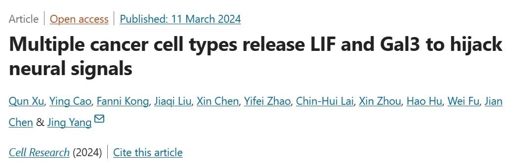 2024年3月11日,北京大学生命科学学院杨竞团队在《Cell Research》上发表题为“Multiple cancer cell types release LIF and Gal3 to hijack neural signals”的研究论文,研究结果阐明了多种癌细胞类型劫持神经系统以促进肿瘤进展的新型共享机制。