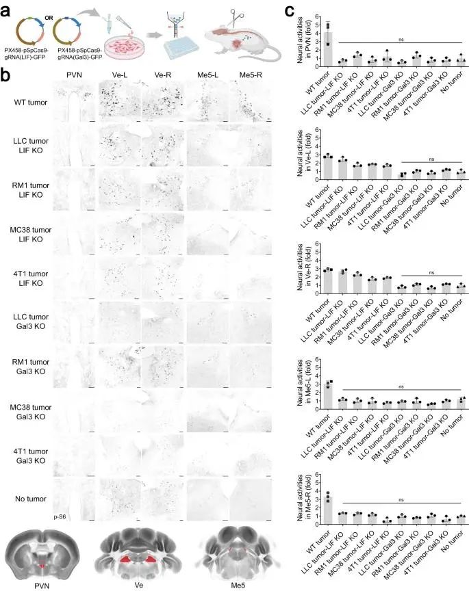 我们探讨了癌细胞衍生的LIF和Gal3信号转导与大脑的疾病相关性。通过CRISPR/Cas9产生具有LIF或Gal3基因缺失的LLC、RM1、MC38或4T1细胞,然后在小鼠同种异体移植模型中进行测试(图3a)。值得注意的是,这些细胞中的LIF敲除(KO)阻断了特征脑区(如PVN和Me5-L/-R)中癌症诱导的活动(图3b,c)。有趣的是,具有LIF缺失的LLC,RM1,MC38或4T1细胞并没有完全消除Ve-L / -R中的神经活动(图3b,c),这与上述观察结果一致,即Gal3可以单独刺激该脑核。同时,癌细胞中的Gal3 KO强制消除了荷瘤小鼠所有特征脑区域的神经活动(图3b,c)。这些结果验证了癌细胞衍生的LIF和Gal3在介导脑对多种类型外周肿瘤的反应中的协同作用。