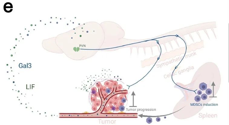 癌细胞衍生的 LIF 和 Gal3 劫持神经系统以促进肿瘤进展的模式图。总之,这项研究阐明了多种癌症类型劫持神经信号以促进肿瘤进展的新颖共享机制(图6e),这对我们更好地理解癌症神经科学的复杂性具有广泛的意义。