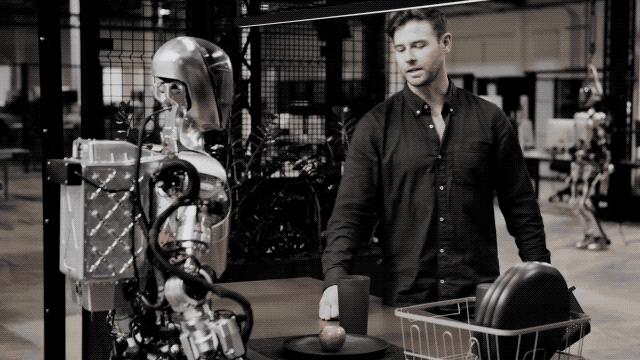 这个模型还同时负责决定执行哪种已学习的闭环行为来响应给定的命令,它将特定的神经网络权重加载到GPU上,并执行相应的策略。这样做之后,Figure 01就有了很多有趣的新功能。例如描述它周围的环境、在做决定的时候运用常识进行推理,并且会理解一些含糊的高级指令,例如当人类说“我饿了”的时候,它会将桌面上唯一的食物——苹果,递给人类,并用简单的英语说明它为什么这么做。