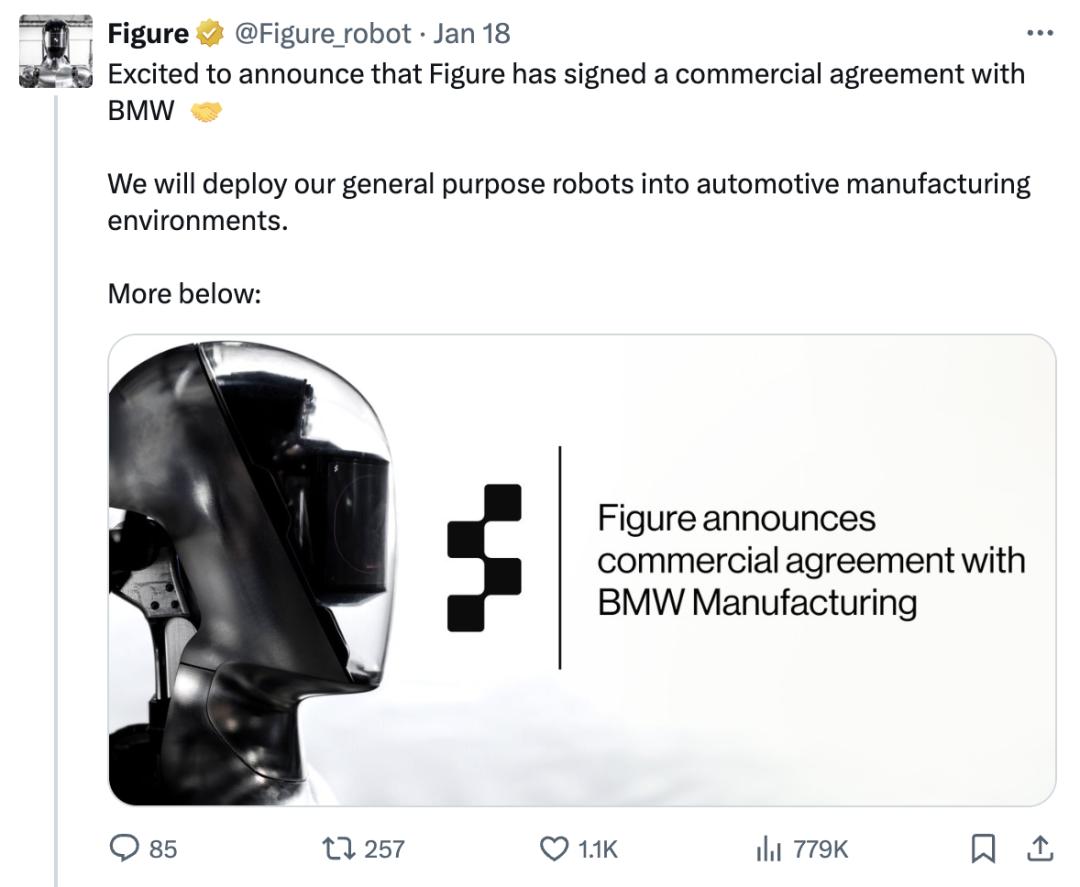当然,在商业化的道路上,Figure也在积极探索。目前,Figure已经和宝马制造公司签订了商业协议,Figure 01已经开始在宝马位于南卡罗来纳州斯帕坦堡的汽车工厂接受测试。