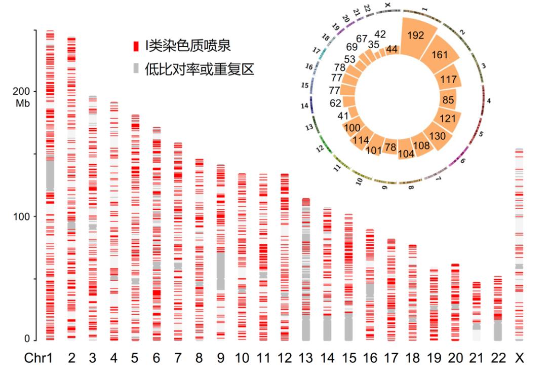 研究团队首先建立了一种名为Repli-HiC的高通量测序方法,该方法利用核苷类似物BrdU瞬时标记复制过程中的细胞,并结合ChIA-PET和原位Hi-C的技术原理检测复制过程中新生DNA区域相关的染色质相互作用。通过Repli-HiC得到的染色质互作矩阵,研究者在人类K562细胞和小鼠胚胎干细胞中观察到垂直于互作矩阵对角线的染色质互作信号,其形状类似于喷泉结构,故将其命名为染色质喷泉,并利用新开发的生物信息学算法Fun,在基因组范围内鉴定出了数千个喷泉位点(图1)。